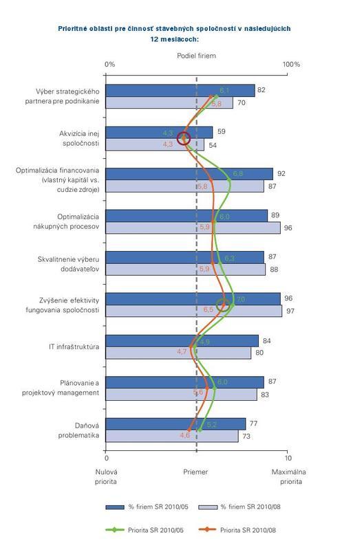 Kľúčovou prioritou je zvýšenie efektivity fungovania stavebných spoločností. Táto ambícia je príznačná tak pre veľké, ako aj stredné/malé stavebné firmy. Najnovšie údaje poukazujú na rozbiehajúcu sa vlnu konsolidácie trhu. Až 73 % spoločností uvádza, že získanie strategického partnera pre podnikanie je ich prioritou na ďalších 12 mesiacov. Ďalšími vysoko hodnotenými podmienkami sú skvalitnenie výberu dodávateľov, optimalizácia nákupných procesov i financovania.