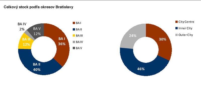 Ako však ukazuje kruhový graf, tento sa – čo do celkových zásob kancelárskych štvorcov – delí spolu s piatym okresom až o tretie miesto, pretože neporovnateľný predstih si v tomto smere stále udržiavajú okresy Bratislava II (40 %) a Bratislava I (36 %). Je to v prvom rade o atraktívnosti a lukratívnosti danej lokality, ktorú sú pre viditeľnosť firemnej značky a jej renomé rozhodujúce. Podiel kancelárií vyhotovených v štandarde A a v štandarde B sa už dlhšie obdobie výraznejšie nemení a zostáva v percentuálnom pomere 60:40.