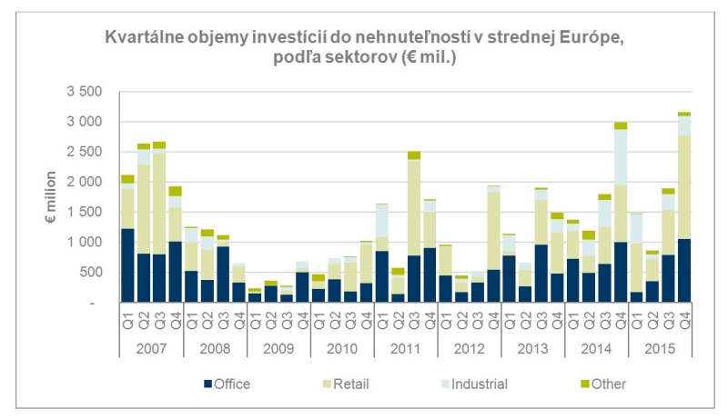 Podľa Cushman & Wakefield sa investičné aktivity na hlavných stredoeurópskych trhoch: v Poľsku, Česku, Slovensku, Maďarsku a Rumunsku výrazne zvýšili v 4. kvartáli 2015 na 3,16 miliárd €, prekonávajúc rekordné úrovne z roku 2006 majúc veľký náskok pred 1,89 miliardami € investovanými v 3. kvartáli 2015 . Celkovo bolo na stredoeurópskych trhoch v roku 2015 investovaných 7,37 miliárd €, čo je len o niečo viac ako v roku 2014 (7,34 mld eur).