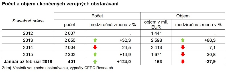V období od januára do februára 2016 vyhlásili investori 1 451 verejných obstarávaní na stavebné práce v celkovej hodnote 306 miliónov EUR. To predstavuje vôbec najvyšší počet v prvých dvoch mesiacoch za posledné štyri roky, teda za sledované obdobie. Ide však prevažne o malé zákazky. Pokračuje tiež zvýšená aktivita investorov v ukončovaní verejných obstarávaní. Konkrétnym stavebným firmám bolo zadaných 401 zákaziek v celkovej hodnote 153 miliónov EUR. Vyplýva to z najnovšej analýzy spracovanej analytickou spoločnosťou CEEC Research na základe údajov poskytnutých Úradom pre verejné obstarávanie ku koncu februára 2016.