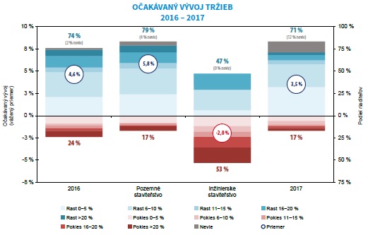 Projektové firmy a architektonické ateliéry budú mať v roku 2016 viac práce než pred rokom. Aktuálne očakáva rast výkonu v tejto oblasti osem z desiatich spoločností (82 percent), pričom priemerný rast by mal dosiahnuť 5,4 percenta. Veľké rozdiely v predpovediach sa však objavujú v závislosti na zameraní firmy. Zatiaľ čo drvivá väčšina (82 percent) spoločností pracujúcich na projektoch pre pozemné stavby predikuje rast o 7,1 percenta, firmy zaoberajúce sa projektami pre inžinierske staviteľstvo očakávajú pokles, a to dokonca až o 4,5 percenta. Sektoru projektových prác sa bude dariť aj v roku nasledujúcom. Riaditelia projektových kancelárií očakávajú v roku 2017 nárast zákaziek o 3,9 percenta, pričom v odbore pozemných stavieb pribudne práce o 4,4 percenta a v inžinierskych stavbách o 1,1 percenta. „Všetko závisí od faktorov doriešenia stále pretrvávajúceho stavu nedoriešenia problémov v oblasti legislatívy v stavebníctve a honorárových poriadkov pre projektantov, ktoré stále nie sú ničím uzákonené, sú informatívne a čím ďalej tým viac podceňované. Štát zasa sprísnil nároky na teplo technické vlastnosti novostavieb, verejných stavieb, a tým vlastne stanovil finančné prekážky pre majiteľov stavieb, ktorí už donedávna mali problém s financovaním stavieb kvôli nízkym finančným prostriedkom z fondov opráv. Navyše, banky sprísnili pravidlá na prideľovanie hypoték, a tak to nevidím príliš optimisticky, skôr naopak, bude sa prehlbovať kríza v stavebníctve. Finančná sila eura je nestabilná a nejasná,“ rozoberá súčasný stav sektora Mikuláš Hladký, architekt zo spoločnosti H & H ARCHITEKT.