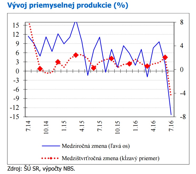 Rekordný prepad priemyslu zapríčinili letné dovolenky v automobilovom priemysle. Výrazný pokles priemyslu ovplyvnili letné celozávodné dovolenky v troch automobilkách. V júli 2016 sa podľa odhadu mohlo vyrobiť o približne 43 tisíc áut menej. V porovnaní s minulými rokmi bolo dovoleniek viac a boli sústredené prevažne do jedného mesiaca. Útlm vo výrobe však zaznamenal aj zvyšok priemyslu. Stavebníctvo taktiež výrazne klesalo. Napriek prudkému poklesu vývoj v priemysle nie je v rozpore s očakávaniami vývoja ekonomiky podľa prognózy NBS P2Q 2016. Výpadok automobilového priemyslu možno vnímať ako jednorazovú záležitosť. Ani na našich významných exportných trhoch zatiaľ nevidieť výraznejší pokles dopytu. Budúci mesiac tak možno očakávať korekciu a rýchlejší rast celého priemyslu. Navyše, letné odstávky sú využívané aj na realizáciu zmien, ktoré súvisia s budúcou výrobou nového modelu (PSA Peugeot-Citroen) alebo s modernizáciou existujúcich modelov (VW). Tieto zmeny by sa v nasledujúcom období mali prejaviť vo zvýšenom záujme o nové automobily.