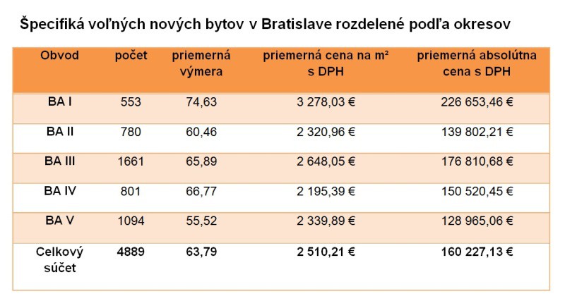 Z hľadiska priemernej rozlohy nedošlo oproti prechádzajúcemu kvartálu k výraznejším zmenám a veľkosť ponúkaných novostavieb tak ostala na úrovni tesne pod 64 m². Oproti minulému roku sa v ponuke nachádzali byty zhruba o 5 m² (resp. o 7%) menšie. Trend klesajúcej rozlohy bytov, ktorého účelom je poskytovať byty za prijateľnejšiu absolútnu cenu aj v lepších lokalitách, sa tak v sledovanom kvartáli pozastavil, keď nová ponuka priniesla zhruba rovnako veľké byty ako tie, ktoré sa predávali v poslednom kvartáli. Pri rovnakej rozlohe no mierne vyššej jednotkovej cene sa absolútna cena ponúkaných novostavieb mierne zdvihla. Priemerná novostavba v Bratislave o veľkosti 63,79 m² tak stála okolo 160 tisíc eur s DPH. Medzi jednotlivými okresmi boli veľmi rozdielne ceny bytov. Zatiaľ čo v Starom meste stál priemerný byt až 227 tisíc eur s DPH v Petržalke vyšiel „len“ na 129 tisíc eur. Rozdiel tu samozrejme tvorila najmä o 20 m² menšia priemerná rozloha ale aj podstatne nižšia jednotková cena. K najvýraznejšiemu rastu absolútnych cien došlo v treťom bratislavskom okrese, kde bola ponuková stránka trhu najsilnejšia. Absolútne tu oproti tretiemu kvartálu cena priemerne veľkého bytu vzrástla o 10,6% resp. o 17 tisíc eur. Dôvodom bol nárast jednotkovej ceny o 5,7% a nárast priemernej rozlohy ponúkaných novostavieb o 4,1%.