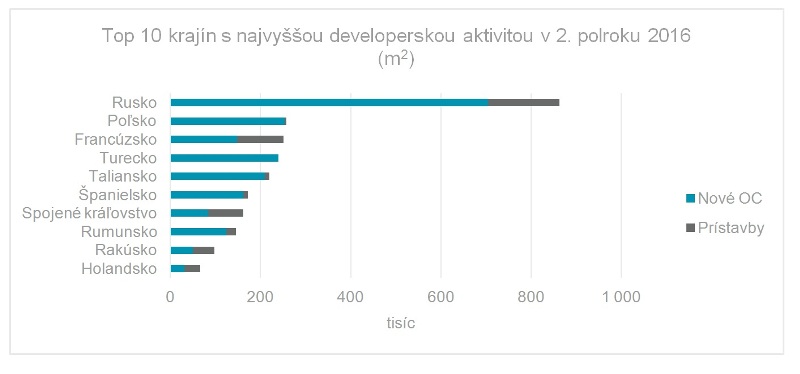 Turecko má naplánovanú najrozsiahlejšiu výstavbu, čo sa týka Európy pre rok 2017 až 2018, pričom objem plánovanej výstavby predstavuje 1,55 milióna m2. Napriek očakávanému zvýšeniu množstva projektov sú plány pozastavené kvôli politickým a ekonomickým rizikám. Rusko sa radí na druhú priečku vzhľadom na pripravenosť na výstavbu v regióne CEE s objemom výstavby 1,46 milióna m2 a kľúčové projekty zahŕňajú otvorenie nákupného centra s plochou 120 000 m2 s názvom Vegas III v Moskve a prístavbou 107 000 m2 nákupného centra Evropa v meste Kursk. V Poľsku sa v rokoch 2017 až 2018 očakáva výstavba 546 000 m2 nových nákupných priestorov, čo je tretí najväčší objem výstavby v regióne CEE.